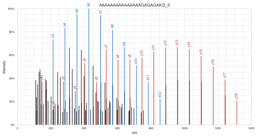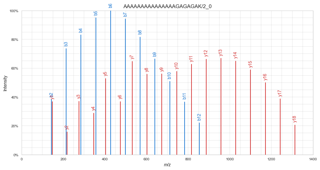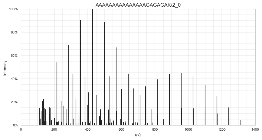 ML-predicted fragmentation peak intensities have proven their value in many applications, for instance, manual spectrum validation, peptide identification (re)scoring, and for generating in silico predicted spectral libraries for data-independant acquisition (DIA) identification.